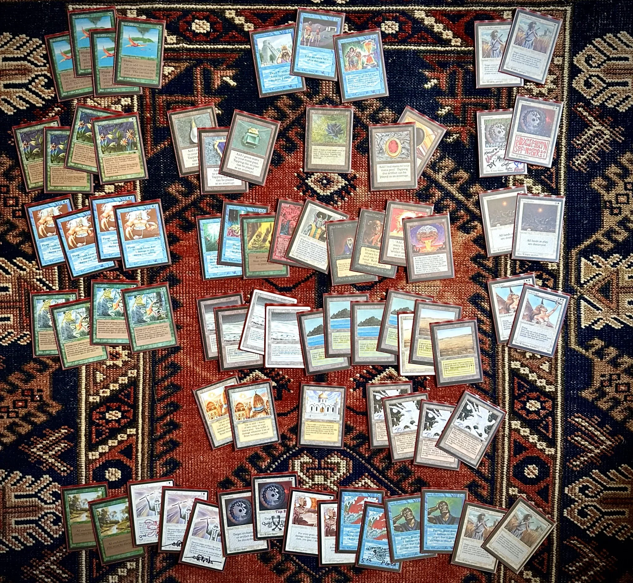This is a collection of deck photos and relevant media from my journey down the wondrous rabbit-hole of Old School Magic the Gathering. I initially started playing Magic in 1995 (I was 8) and the very first card in my very first Revised booster was a Howl From Beyond. I came back into, and fell back out of, Magic many times since but after almost a decade off, I finally discovered Old School in early 2016. My favorite card as a kid was always Birds of Paradise and I started playing with it when I came back to the game. I’ve made dozens of incremental changes over the past 4 years, but most of the cards I’m still playing with were in the very first iteration.